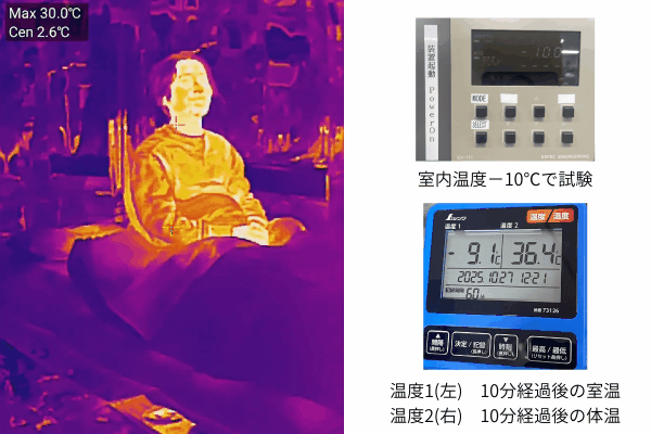 10分後「室温-9.1℃」「体温36.4℃」計測結果。「AURORA DOWN」を掛けている顔以外は冷気を感じることなく、体温変化もなく、-10℃環境下でも快適に使用できました。