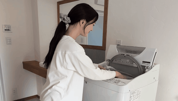 洗濯する場合、洗濯ネットに入れて単独でお洗濯してください。コンパクトなので、6.5㎏の洗濯機でもこのようにスムーズに入ります。