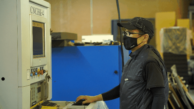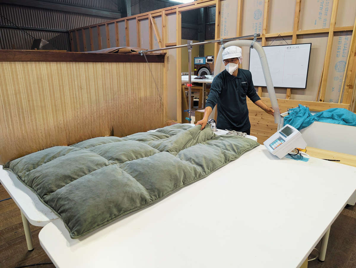 福岡大川工場にて1マスずつ均一に羽毛を吹き込みます。