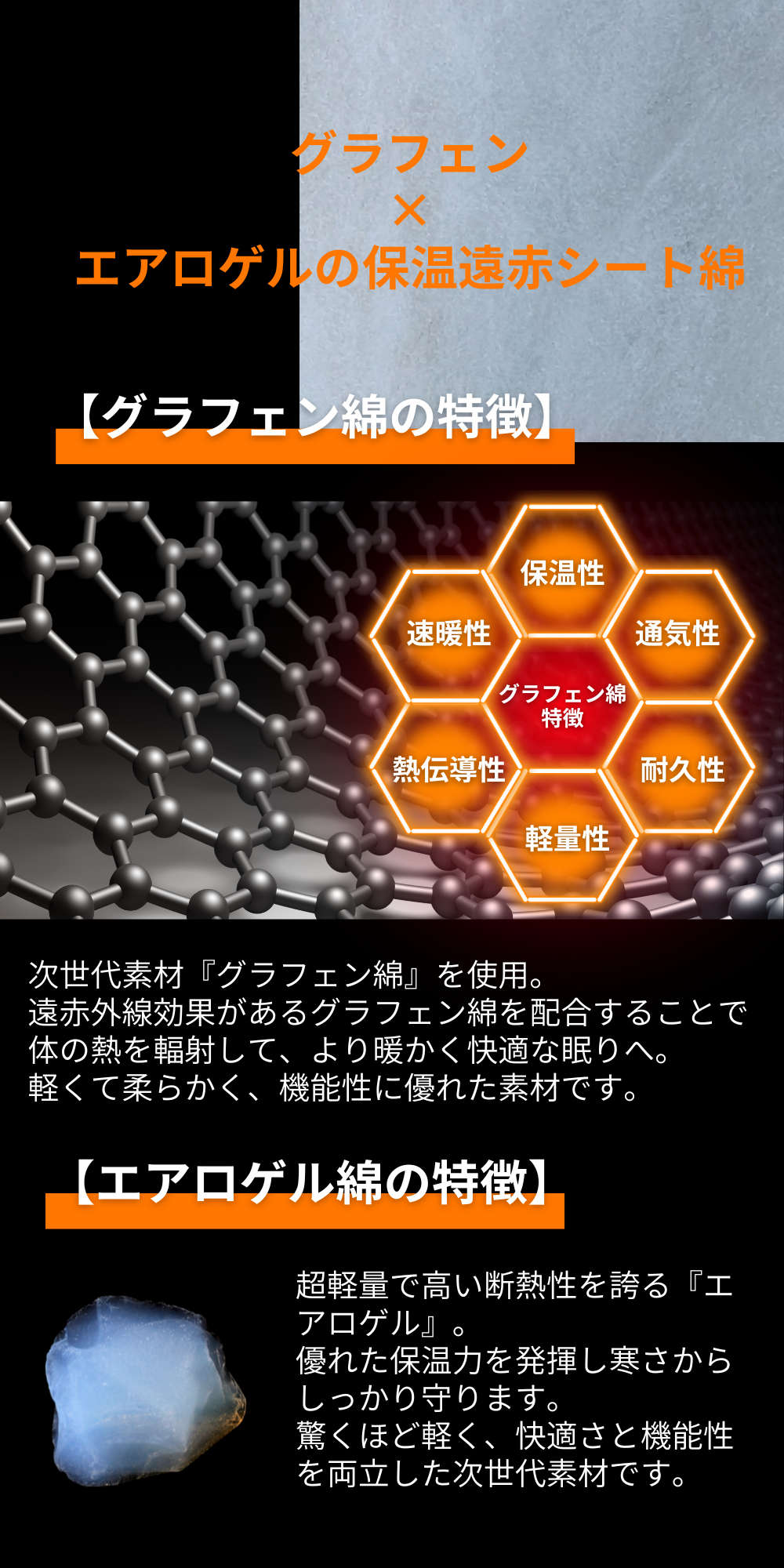 シート綿:ポリエステル100%(エアロゲル綿30% グラフェン15% レギュラー綿55%)