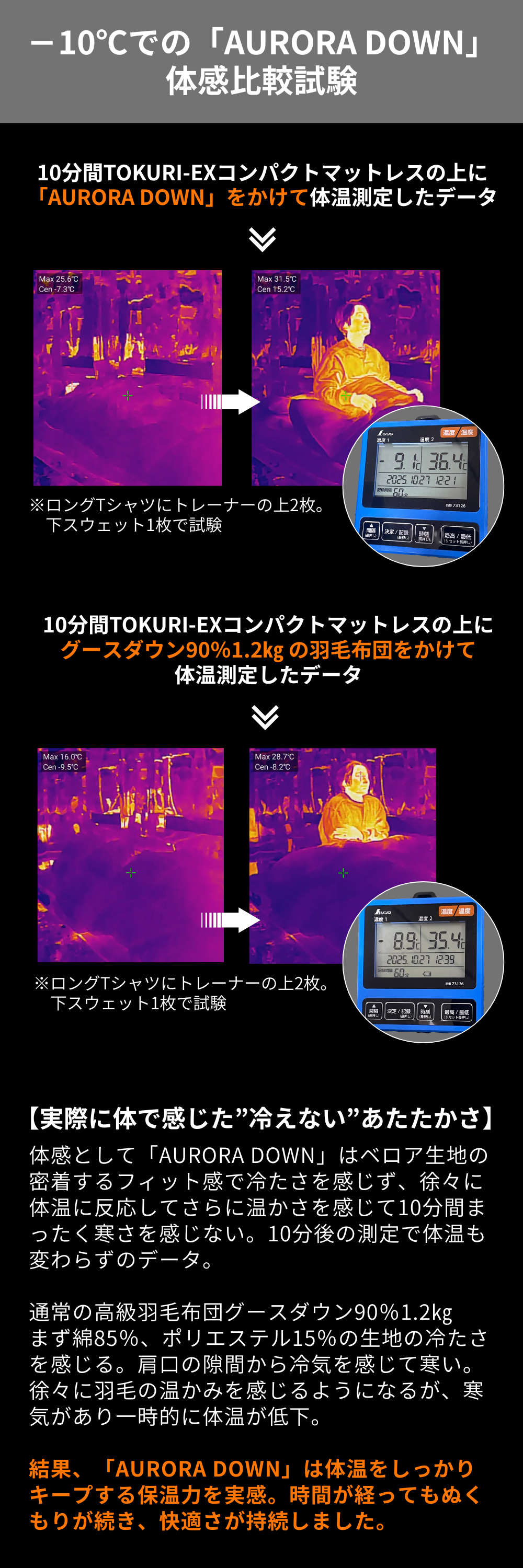 -10℃環境下で「AURORA DOWN」を使用して横になって実際に寝て測定