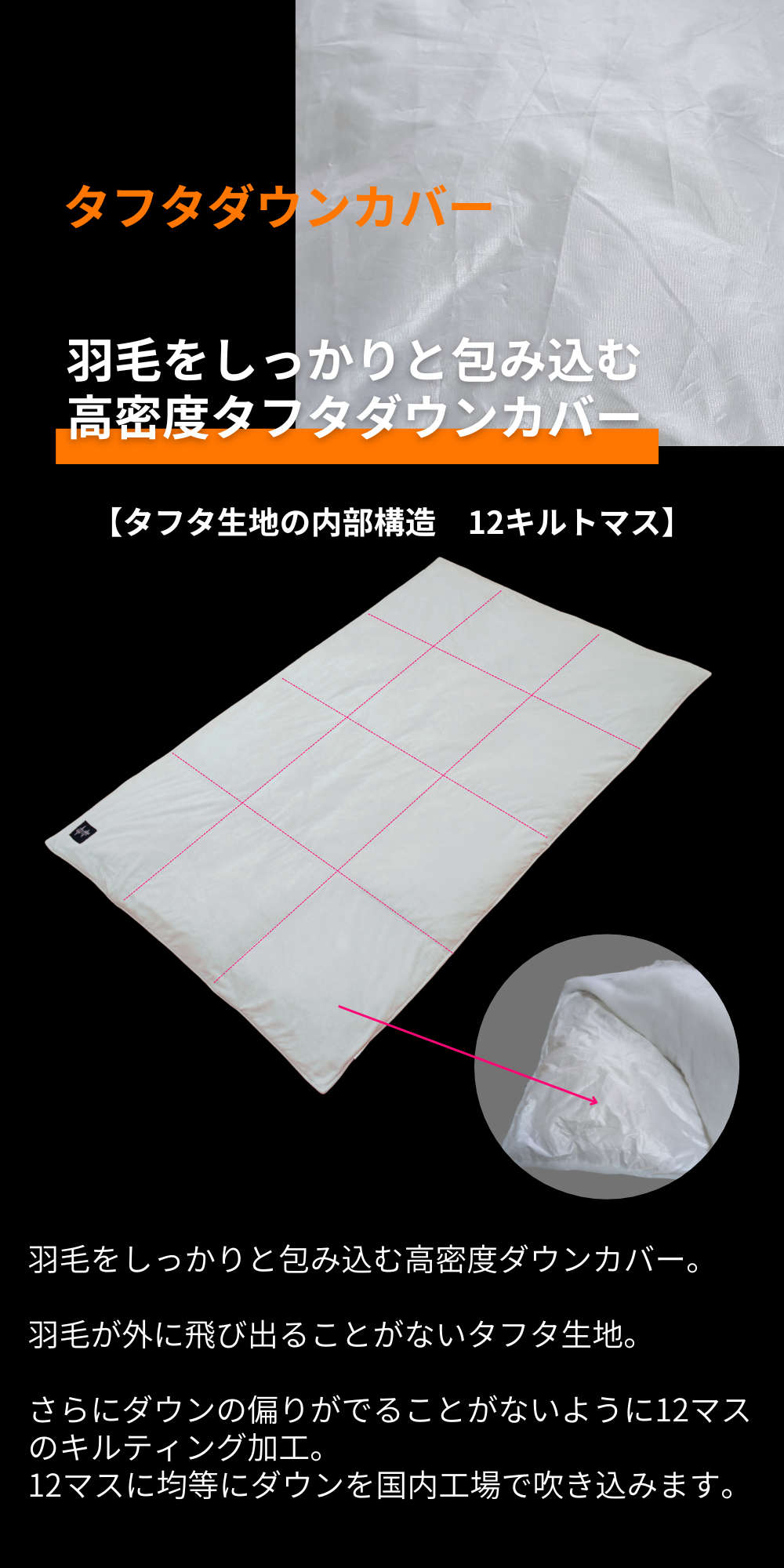ポーランドダウンが生地内で偏りができないように12マスのキルト構造になっています。