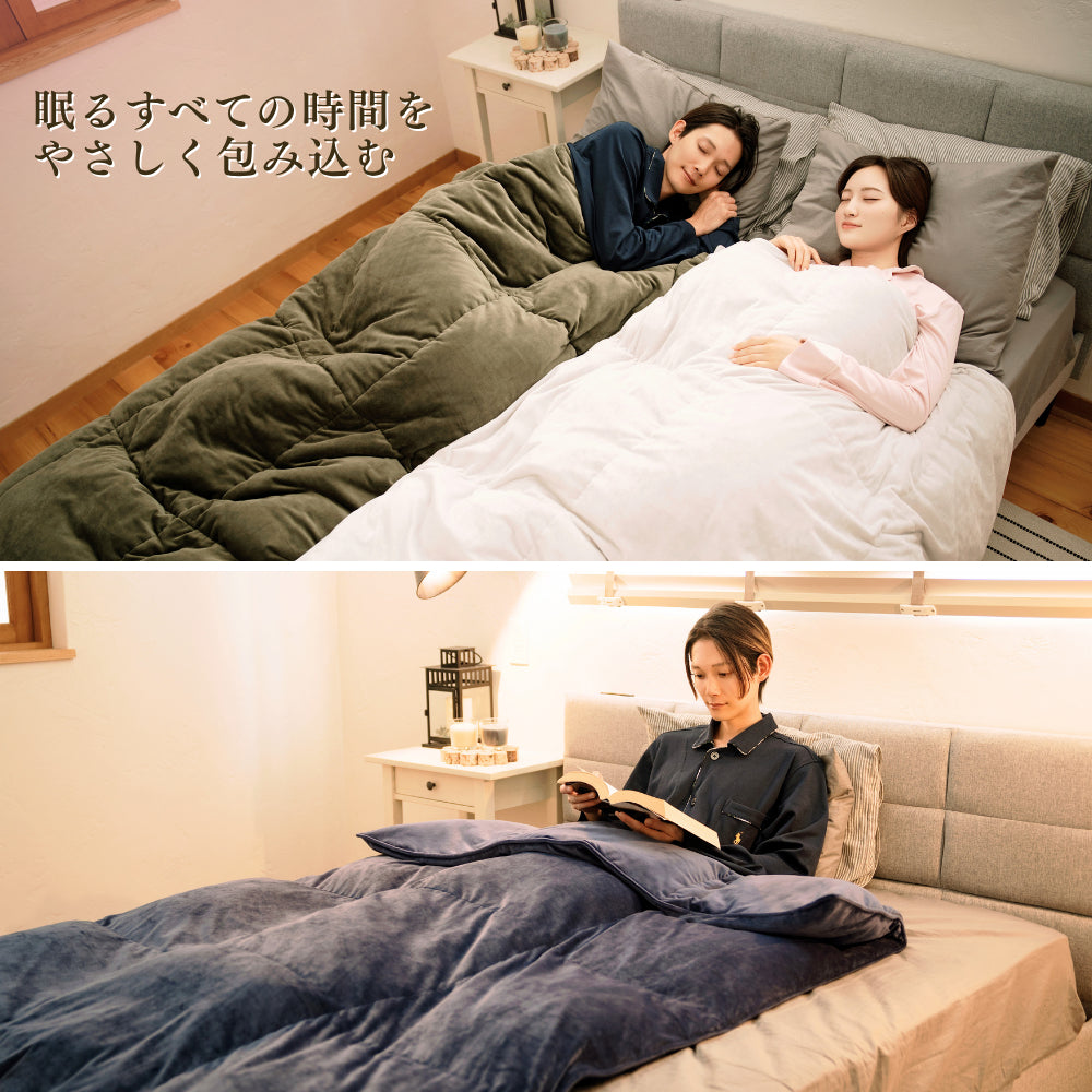 思わず頬ずりしたくなる心地よさ。触り心地のよいベロア生地。中の綿と羽毛の気持ち良さで包み込まれます。掛けふとんの「最初冷たくてひやっと感じる」ということもありません。